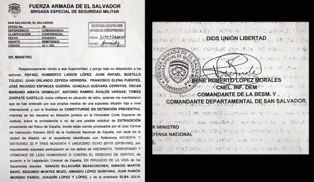 El domingo 7 de agosto de 2011, la Policía buscaba a los militares salvadoreños requeridos por España por el asesinato de los sacerdotes jesuitas en 1989. Sorpresivamente, lograron refugio en un cuartel cuyo comandante era el coronel René Roberto López Morales, quien desde hace 10 días es asesor del partido de izquierdas para la elección presidencial de 2014 y que según el informe de la Comisión de la Verdad supo de antemano del plan de asesinar a los religiosos y no hizo nada por evitarlo.